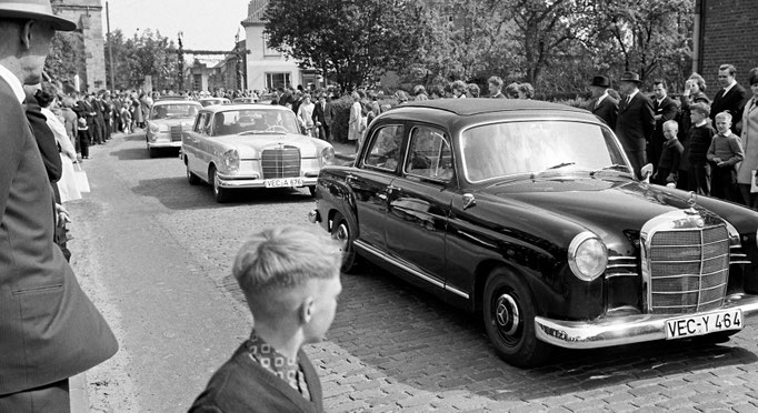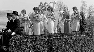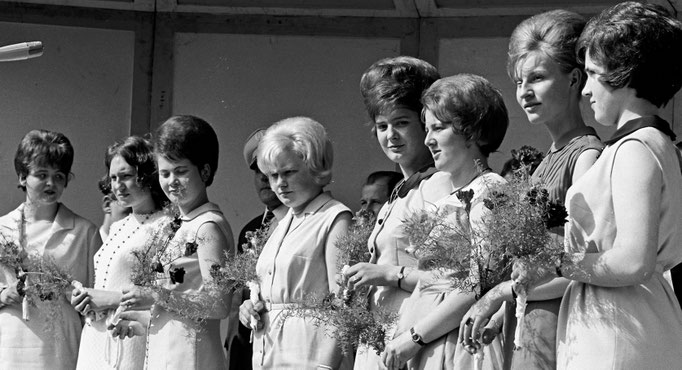 Acht festlich gekleidete Ehrendamen mit kunstvoll hochgesteckten Frisuren präsentieren sich auf einem prächtig geschmückten Festwagen. von li. Marianne Sommer, Gisela Schlotmann, Helene Schröder, Veronika Heckmann, Rita Wehry, Ruth Mählmann, Maria Fangmann, gelenkt wird der Wagen von Josef Brinkhus und Otto Tabeling. Für die zahlreichen Besucher am Straßenrand und die teilnehmenden Musiker war dieser Anblick ein besonderer Höhepunkt des Festumzuges.“