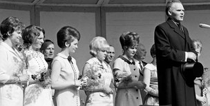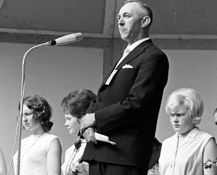 Auf dem Festplatz am Pastors Busch heißen Bürgermeister Clemens Hölscher und Pfarrer Josef Schraad, flankiert von den Ehrendamen, die zahlreich erschienenen Musiker und Gäste herzlich willkommen.“