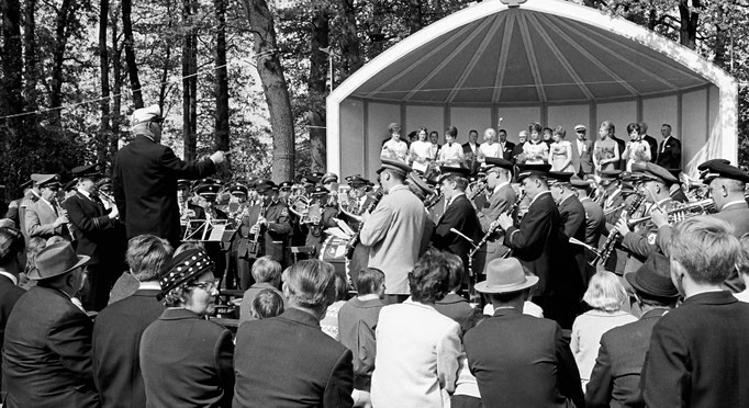 Hier sind die Musiker des Musikevereins Bakum kurz vor dem Musiker-Bundesfest im Mai 1965 zu einem Gruppenfoto versammelt. Vorne von li. Josef Dernjac, Josef Tabke, Bernhard Mählmnn, Klemens Tabke, Werner Kuper (Dirigent) Bernhard Schröder, Heinrich Niemann, Aloys Hackmann, Heinrich Hellbernd, mitte: Helmut Middendorf, Rudolf Schlotmann, Otto Fraas, Harry Vocke, Bernd Börgerding, Hermann Ostendorf, Ewald Hellmann, Clemens Kalkhoff, Hans Höffmann, Karl-Heinz Hartke hinten: Anton-Günter Kollmer, Clemens Heckmann, Josef Henke, Clemens Hartke, Ludger Pille
