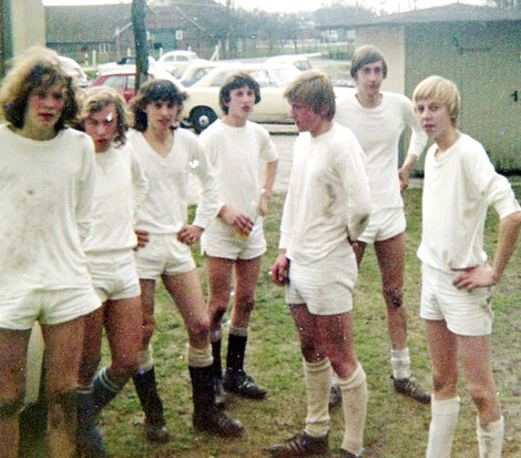 A-Jugend 1970/71: kurz vor Spielbeginn mit dem Kassenhäuschen im Hintergrund von lniks: Hansi Hoping, Josef von Lehmden, Clemens Hölscher, Albert Dödtmann, Ludger Grave, Dieter Rasche, Hubert Stolle