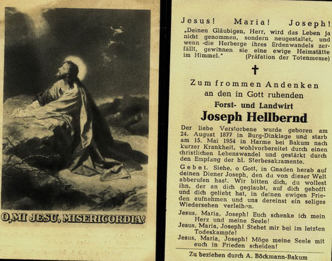 Totenbild von Josef Hellbernd, Harme, verstorben am 15.5.1954